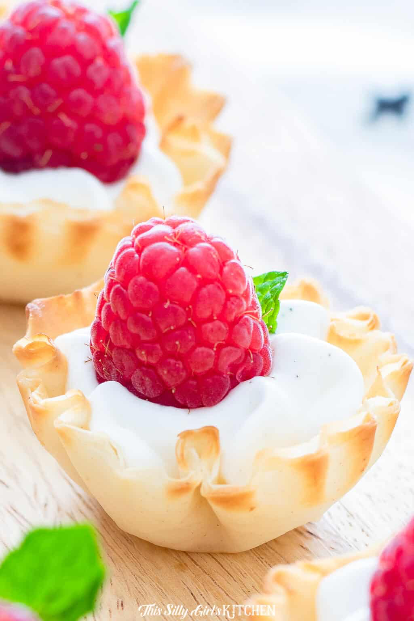 Lemon-scented whipped cream and fresh berries in mini phyllo cups, an elegant raspberry dessert.