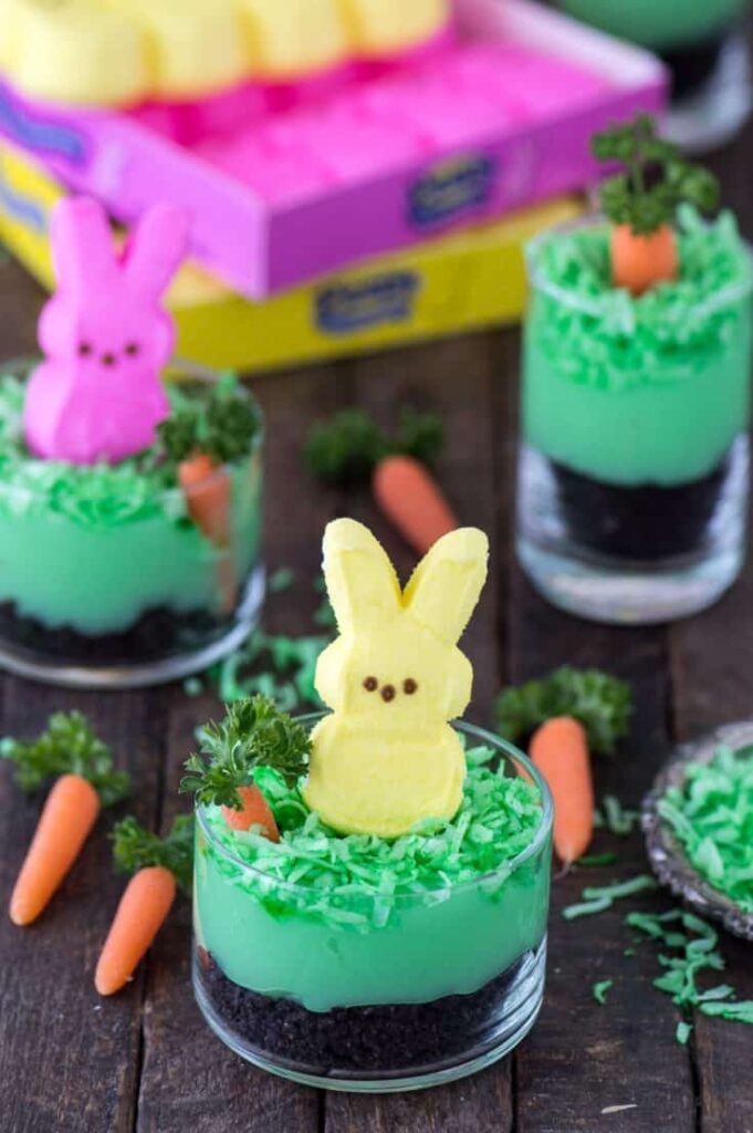 Peeps bunny pudding cups with oreos, coconut, a mini carrot and peeps. This is a fun treat to serve during the spring season to anticipate Easter or you could keep this recipe handy after the eater bunny delivers his goodies.