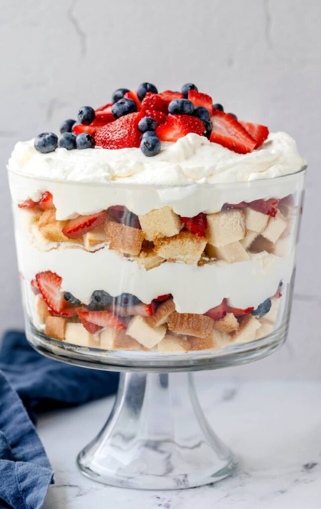 Red white and blue trifle is a delicious no-bake berry trifle made with fresh blueberries and strawberries, pudding mix, pound cake, and whipped cream. This seriously simple dessert takes just 7 ingredients and 15 minutes to put together.