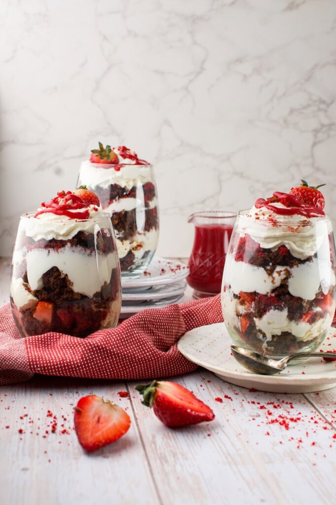 This grain-free red velvet parfait is a festive, layered dessert made with leftover grain-free red velvet muffins, creamy yogurt, strawberries, and optional cream cheese frosting.