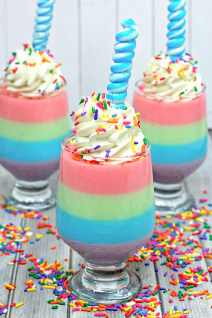 Unicorn Jello cups are a quick and easy layered Jello dessert recipe perfect for a unicorn party or just for fun.