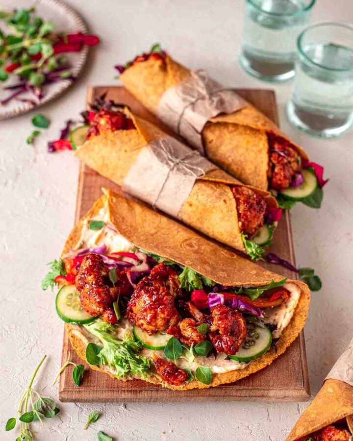 Roasted maple BBQ cauliflower bites in sweet potato wraps with a herby butter bean spread and loads of fresh vegetables. The wraps are wholesome finger-licking goodness.