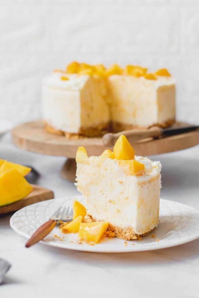 This no bake mango cheesecake recipe is a tropical delight, combining the sweetness of ripe mangoes with the tang of lemon and the richness of cream cheese, all set on a buttery biscuit crust.