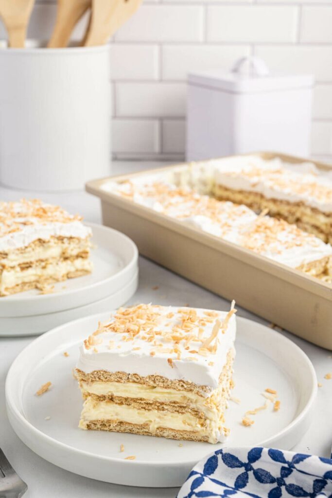 Coconut Icebox Cake is a sweet and super easy no-bake summer and springtime dessert with layers of creamy coconut filling, whipped topping, and graham crackers, the perfect cold treat for a hot day.