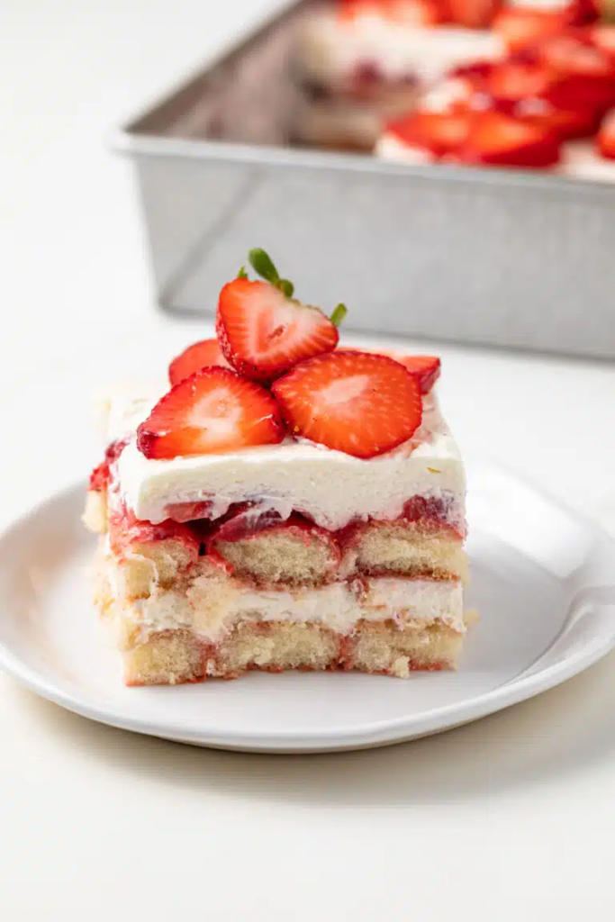 This easy Strawberry Tiramisu is a flavorful no-bake treat for summer. Store-bought ladyfinger cookies dipped in sweet strawberry juice and layered with whipped mascarpone cream and macerated strawberries.