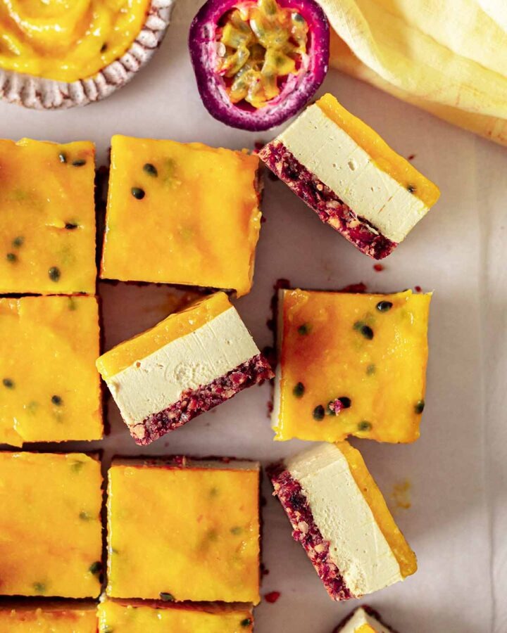 Creamy vegan mango cheesecake bars that are no-bake, packed with wholesome ingredients and are coconut-free!
